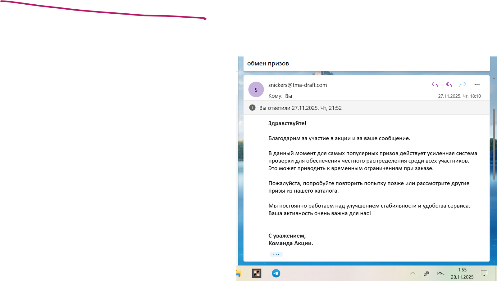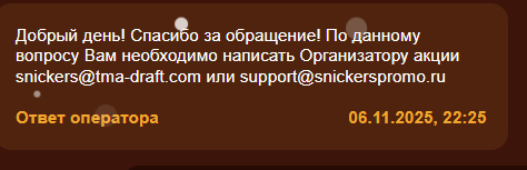 С 1 ноября 2025 года участвуйте в акции от Snickers. Покупайте продукцию Snickers®, Twix®, Mars®, Bounty®, Milky Way®, участвующую в акции, регистрируйте чек, получайте 1 балл за каждые 50 рублей в чеке, обменивайте баллы на призы.