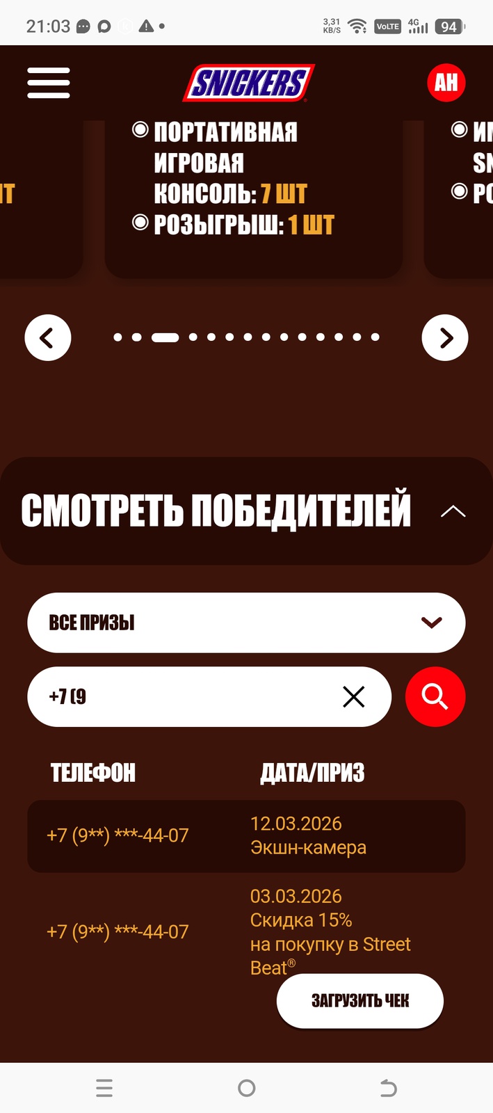 С 23 февраля 2026 года участвуйте в акции от Snickers. Совершайте покупки продукции, участвующей в акции, регистрируйте чек и выигрывайте призы.