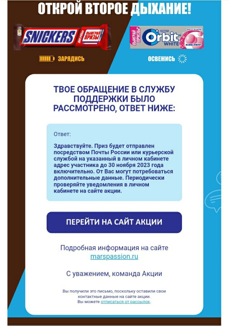 Покупайте шоколадные батончики Snickers, Twix или жевательную резинку Orbit с 14.08.2023 по 08.10.2023, зарегистрируй чек на сайте акции и участвуйте в розыгрыше призов.