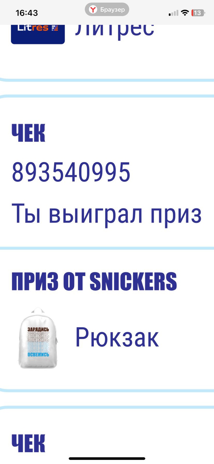 - «Ценные Призы за регистрацию чеков продукции «SNICKERS®», «TWIX®»: