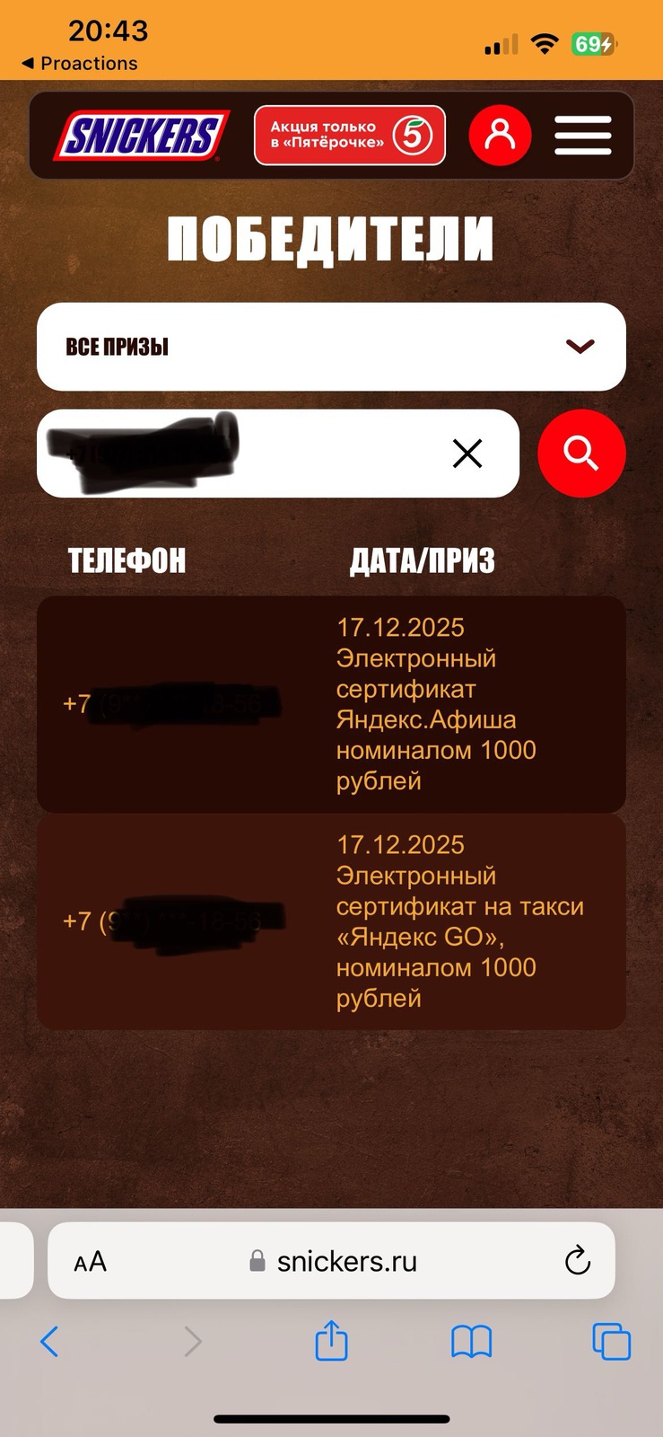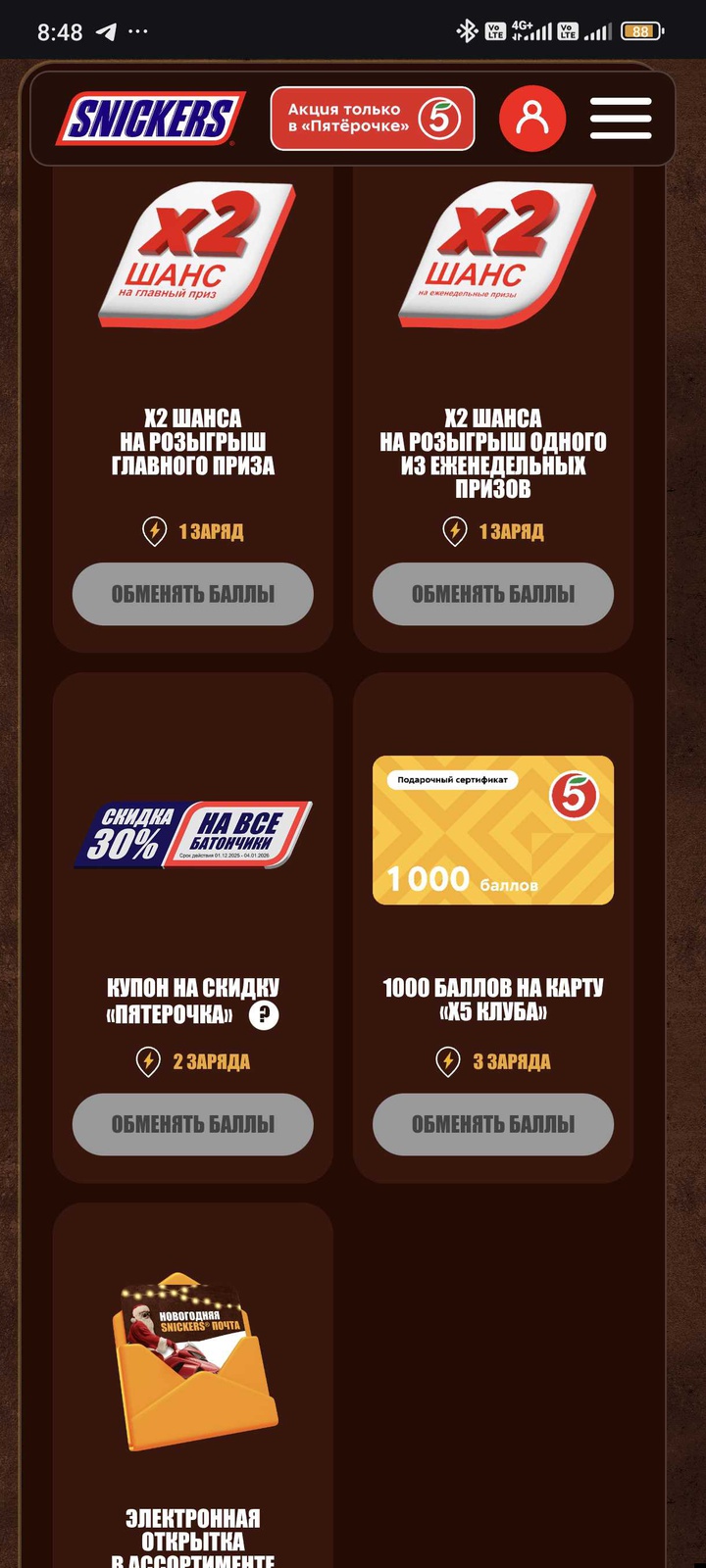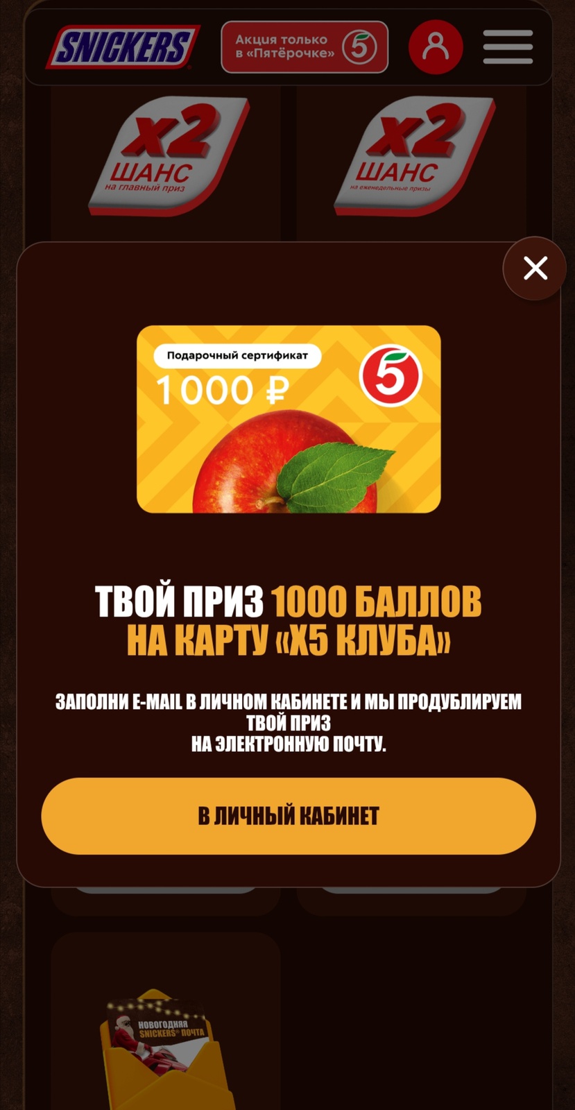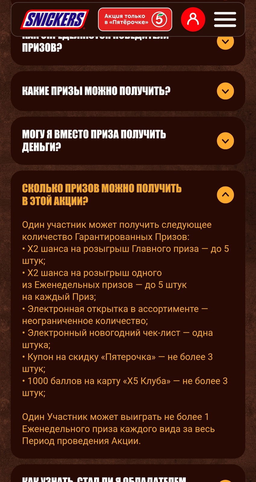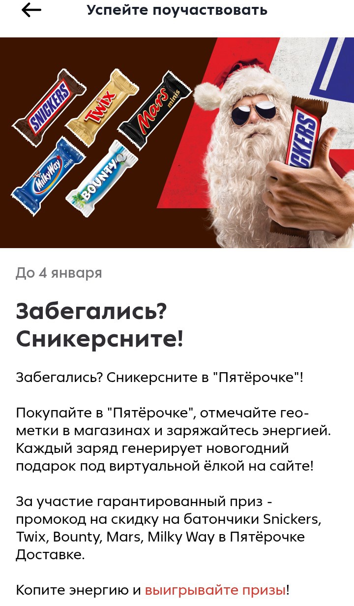- За участие гарантированный приз - промокод на скидку на батончики Snickers, Twix, Bounty, Mars, Milky Way в Пятёрочке Доставке.