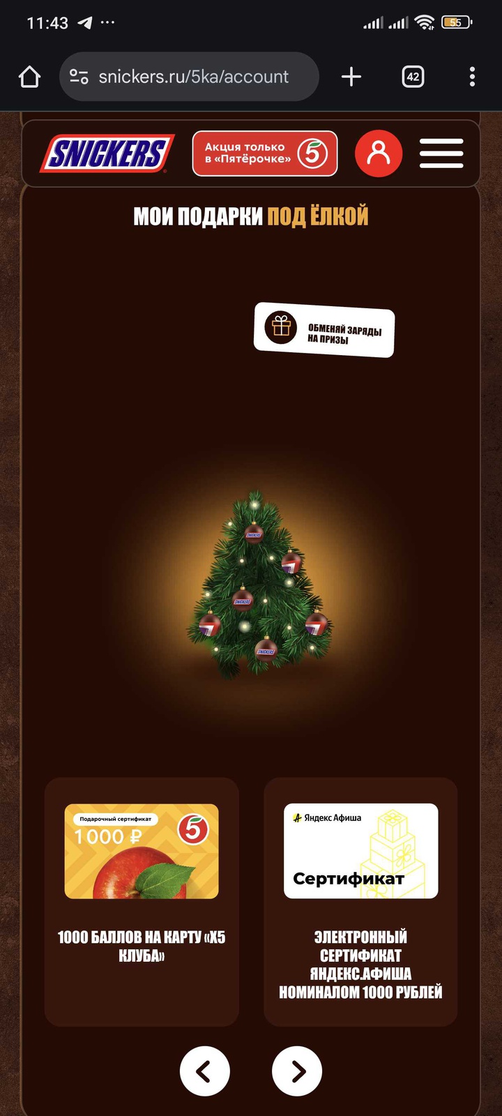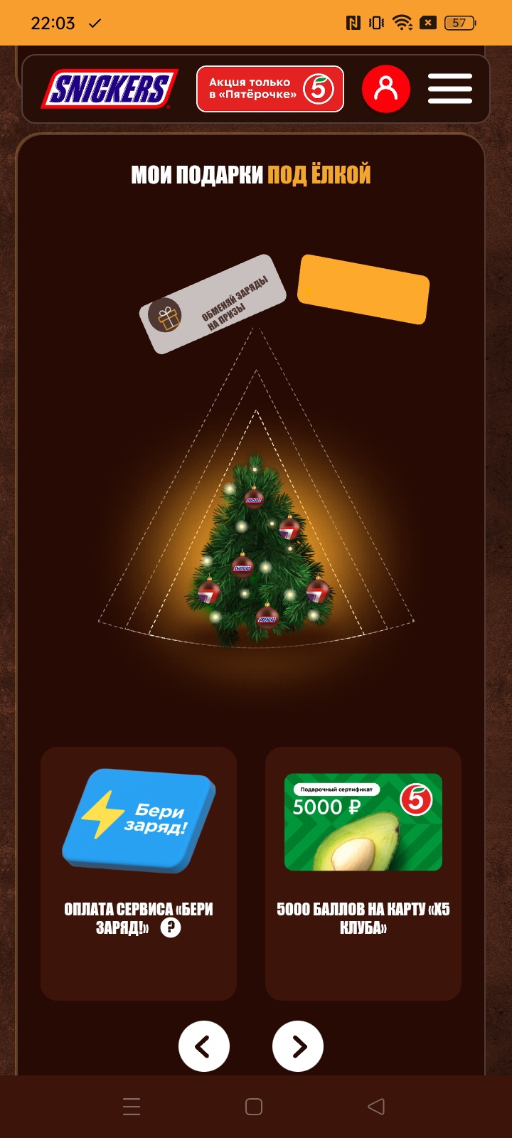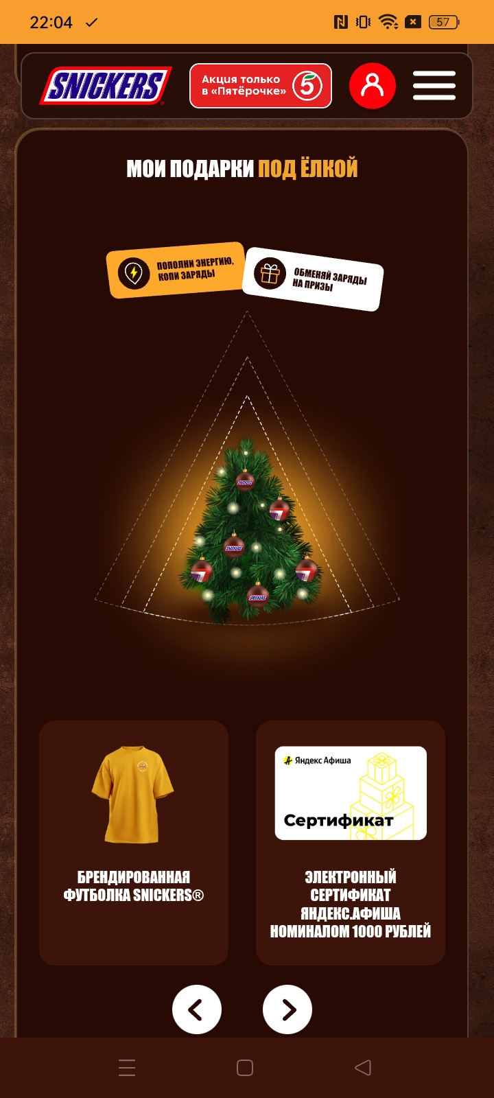 - Покупайте в магазинах «Пятёрочка», отмечайте гео-метки в магазинах и заряжайтесь энергией. Каждый заряд генерирует новогодний подарок под виртуальной ёлкой на сайте!