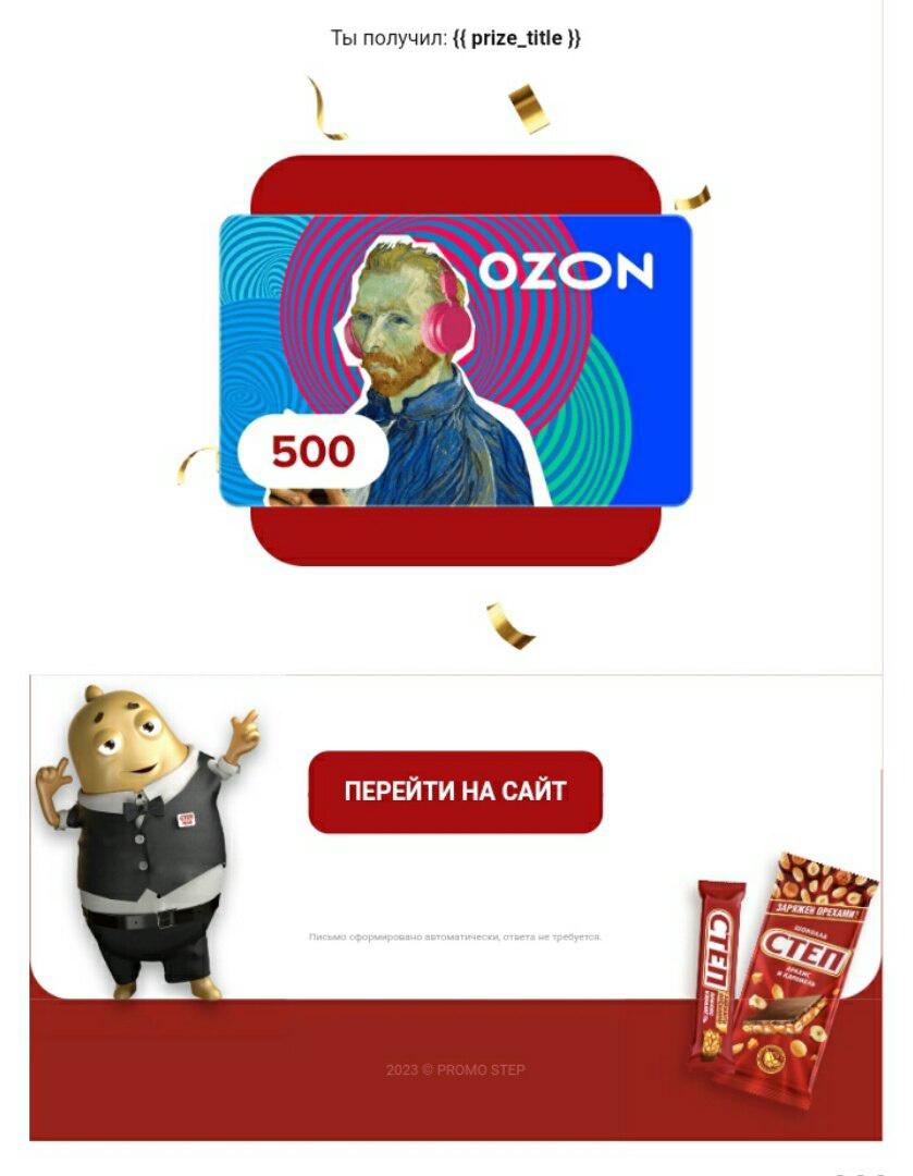- Каждый загруженный чек дарит тебе шанс покрутить барабан и выиграть сертификат Ozon на 500 1000 или 3000 рублей, классный стикерпак в Telegram, a также зажигательный танец Мистера Ореха!