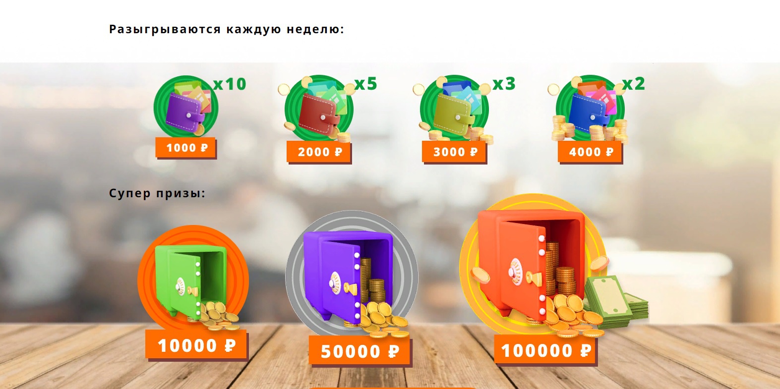 - Денежные призы на 10 000, 50 000, 100 000 рублей.