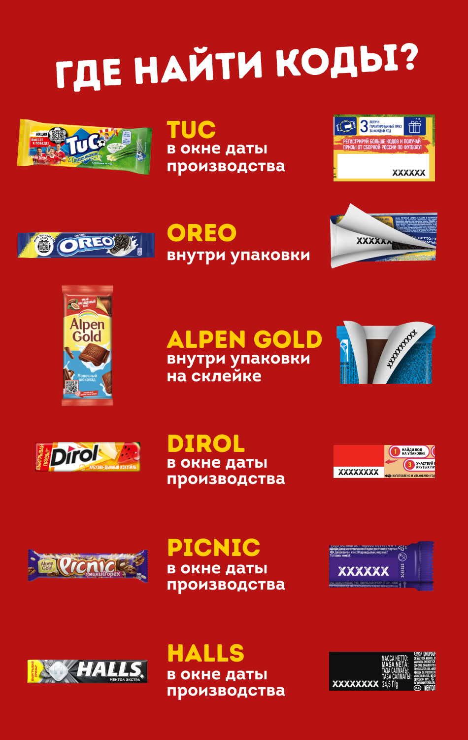 - Продукция под товарными знаками «AlpenGold», «TUC», «Oreo», «Picnic», «Halls», «Dirol».
