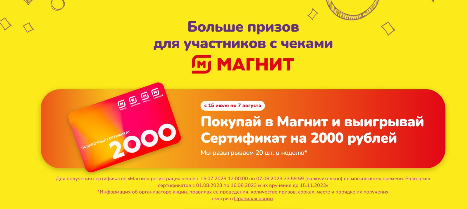 - с 15 июля по 7 августа покупайте продукцию, участвующую в акции, в Магнит и выигрывайте сертификат на 2000 рублей. Розыгрыш 20 сертификатов в неделю.