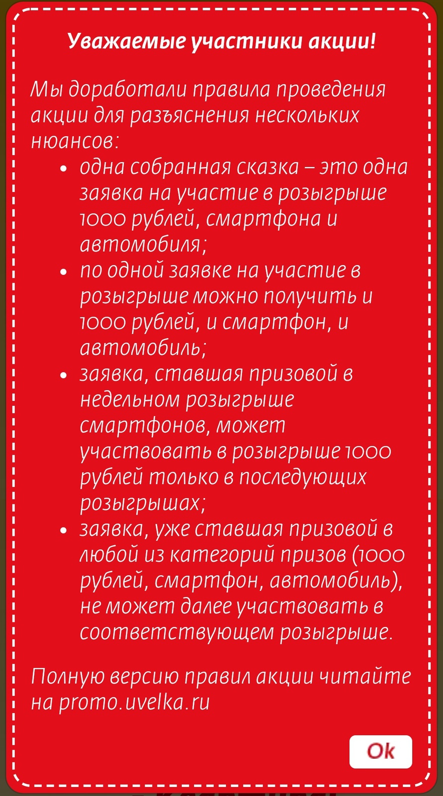 - Каждая собранная сказка участвует в еженедельном розыгрыше смартфона и 1500 призов по 1000 руб.;