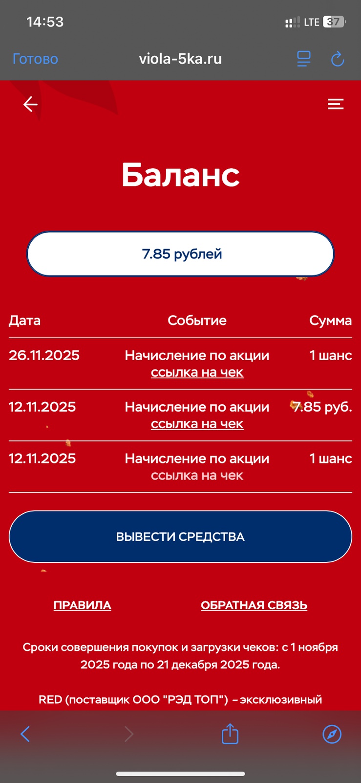 - Получайте кешбэк до 10% за покупку, а также гарантированный приз за первый чек с Viola и участвуйте в розыгрыше призов от Viola и RED, а также главного приза - 500 000 руб.;