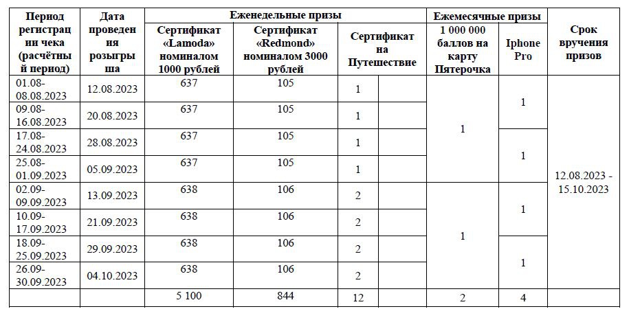 - Сроки приобретения Продукции и регистрация чеков покупателем для участия в Акции: с 00 часов 00 минут 01 секунды «01» августа 2023 г. по 23 часа 59 минут 59 секунд «30» сентября 2023 г.