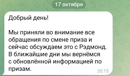 Мы приняли во внимание все обращения по смене приза и сейчас обсуждаем это с Рэдмонд. В ближайшие дни мы вернёмся с обновлëнной информацией по призам.