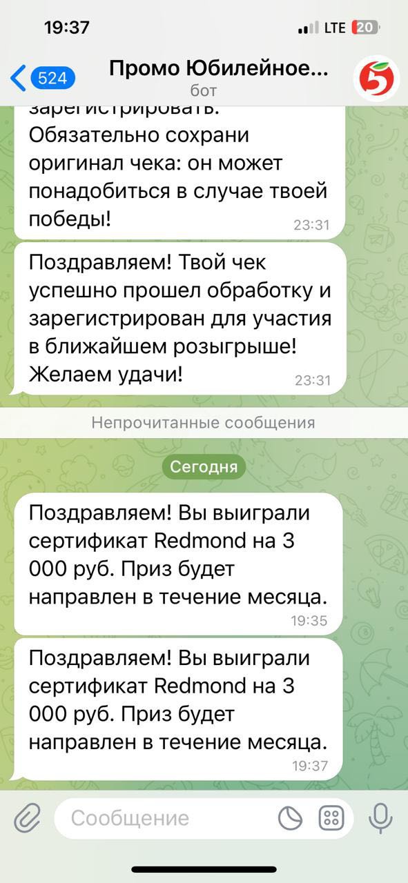 - Регистрируйте чеки в телеграм бот https://t.me/Promo_Jubilee_5kabot;