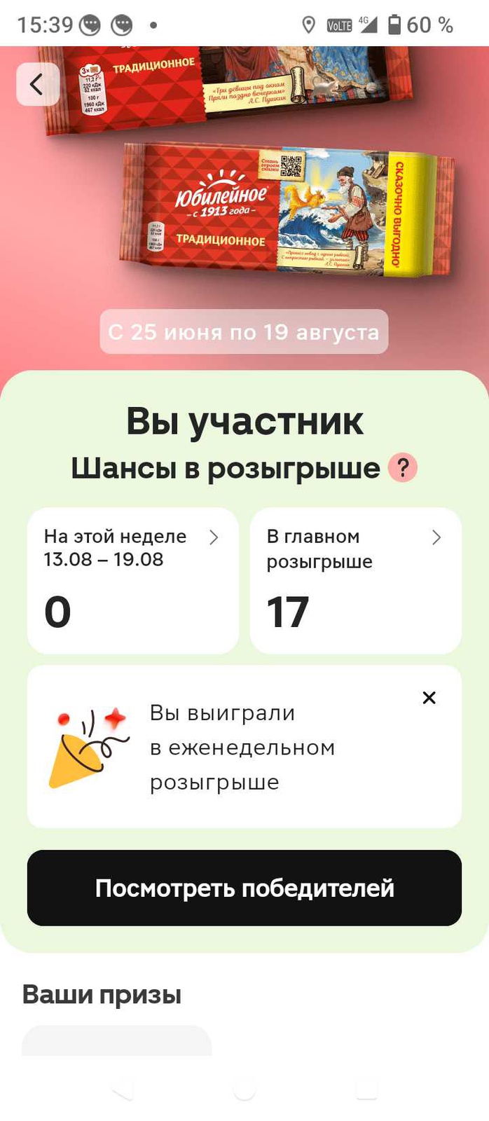 - Необходимо с 25.06.2025 по 19.08.2025 подтвердить участие в акции в блоке «Розыгрыши», нажав кнопку «Участвовать» на детальной странице Розыгрыша, и приобрести упаковку/и продукции под товарным знаком «Юбилейное» от 1 (одной) штуки в одном чеке с обязательным предъявлением карты «Магнит Плюс» из мобильного приложения;