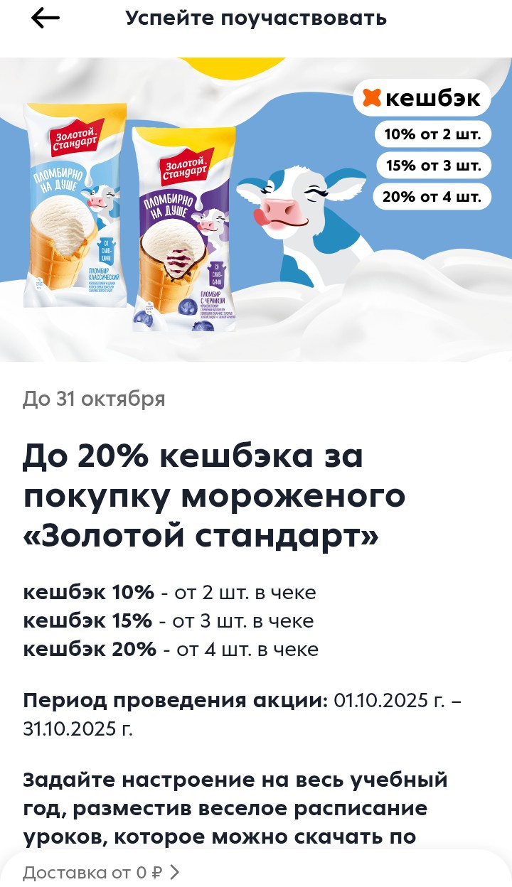 - До 20% кешбэка за покупку мороженого «Золотой стандарт»;