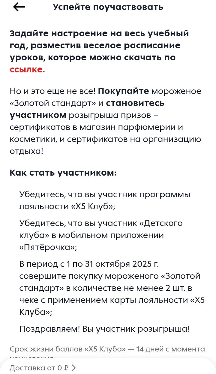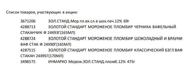 - В период с 1 по 31 октября 2025 г. совершите покупку мороженого «Золотой стандарт» в количестве не менее 2 шт. в чеке с применением карты лояльности «X5 Клуба»;