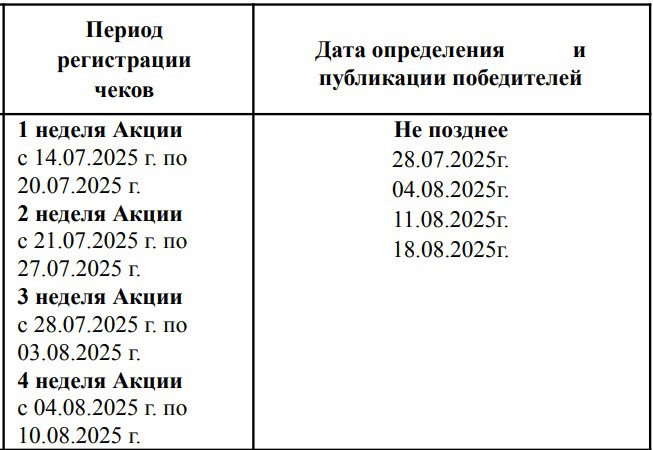 - Период приема заявок на участие (срок совершения покупки Продукции): с 00:00 14.07.2025 по 10.08.2025 23:59 года (по московскому времени).
