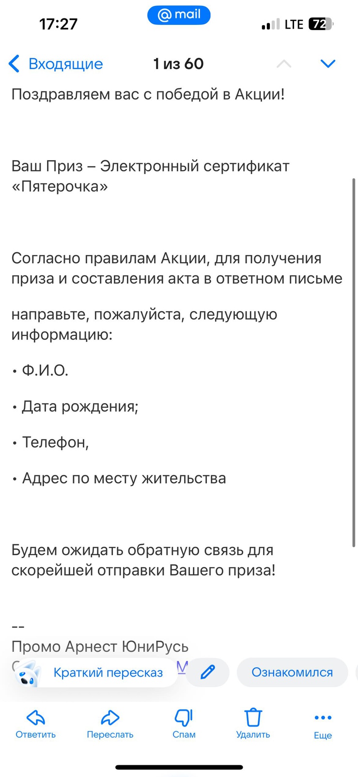 Муж вчера выиграл , по данным все сходиться почта , телефон , имя .