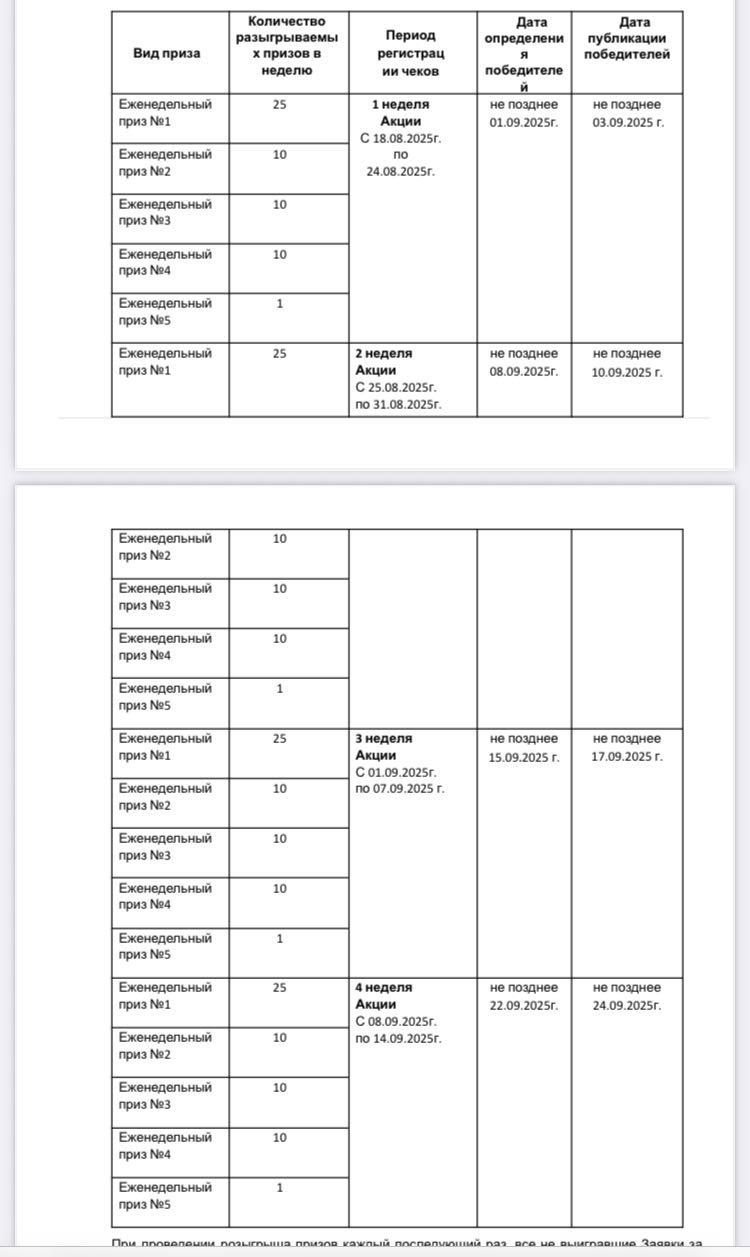 - Период приема заявок на участие (срок совершения покупки Продукции): с 00:00:01 18.08.2025 по 23:59:59 14.09.2025 (по московскому времени).