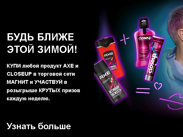 Будь ближе этой зимой! Купи любой продукт Axe и CloseUp в торговой сети «Магнит» и участвуй в розыгрыше крутых призов каждую неделю.
