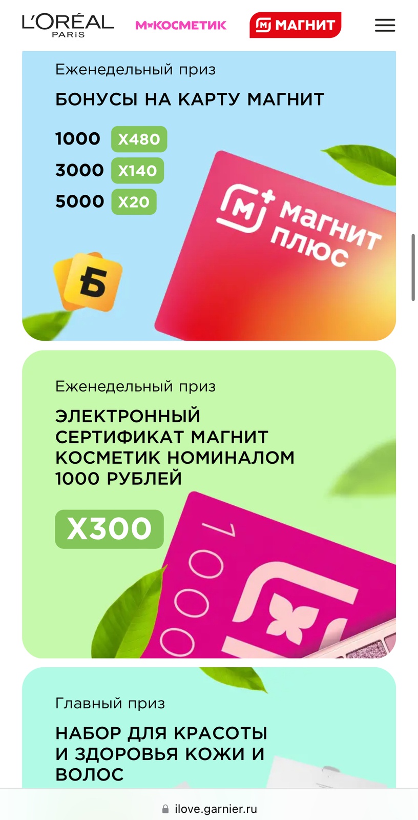 - 1 000 бонусов на карту Магнит Плюс - 480 шт.;