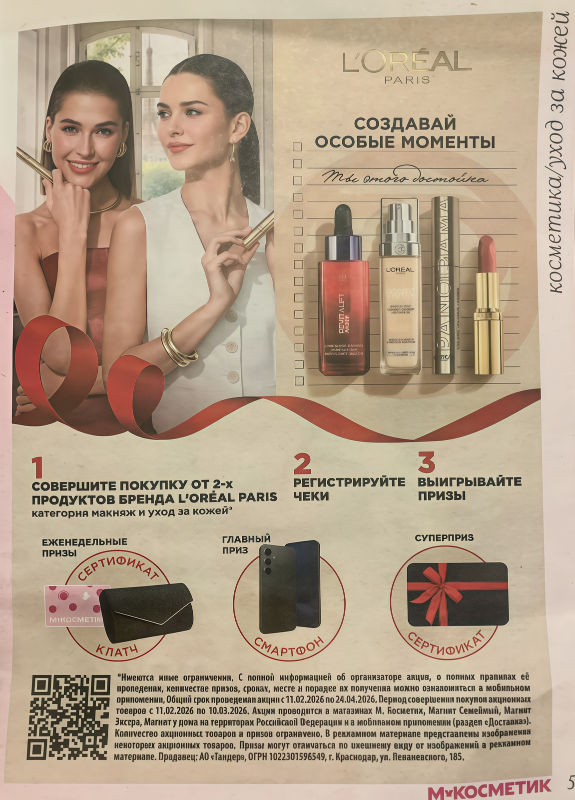 С 11 февраля 2026 года участвуйте в акции от L'oreal Paris в магазинах «Магнит». Покупайте от 2-х продуктов L'oreal Paris категории макияж и уход за кожей в магазинах «Магнит», участвующих в акции, регистрируйте чек и выигрывайте призы.