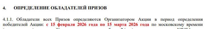 - Период приобретения продуктов для участия в Акции: с 00 часов 01 минуты 01 секунды по московскому времени 4 февраля 2026 года по 23 часа 59 минут 59 секунд по московскому времени 3 марта 2026 года.