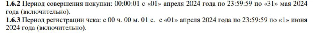1.6.3 Период регистрации чека: с 00 ч. 00 м. 01 с. с «01» апреля 2024 года по 23:59:59 по «1» июня
