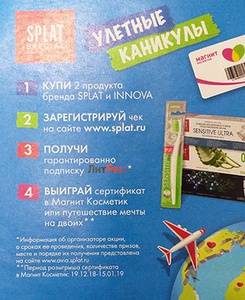 С 19 декабря 2018 года участвуй в акции от Splat и магазинов "Магнит Косметик". Купи 2 продукта бренда Splat и Innova, участвующих в акции, регистрируй чек и получи возможность выиграть путешествие и другие призы!
