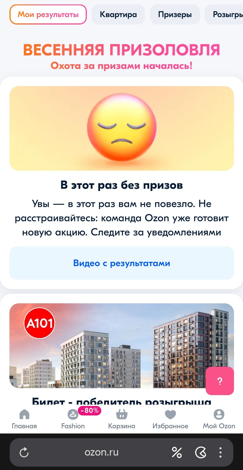 Охота за призами началась! Выполняйте задания, получайте подарки и участвуйте в розыгрыше призов. Главный приз - квартира в Москве! А еще вы можете выиграть баллы Ozon, технику Apple и PlayStation 5, путешествие от Ozon Travel и многое другое.