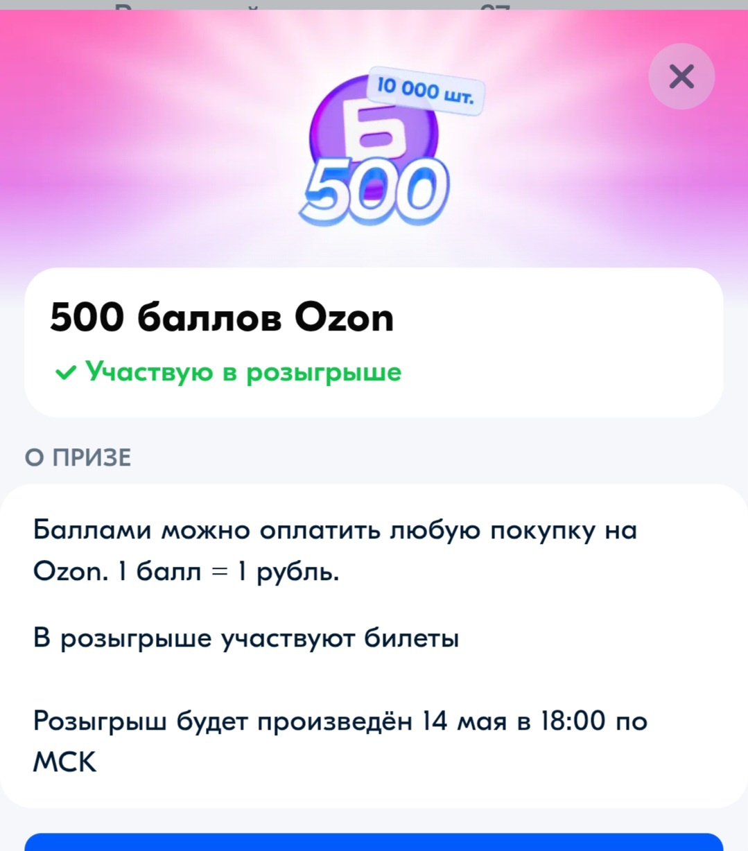 - Промокод на 500 Баллов Ozon - 10 000 шт.;