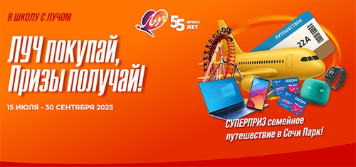 Покупайте продукцию Луч на сумму от 200 рублей в любом магазине или на маркетплейсе, регистрируйте чек и выиграйте суперприз - семейное путешествие в Сочи Парк и другие призы. Луч покупай, призы получай!