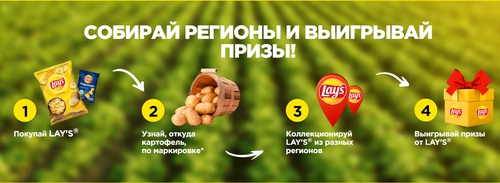 Узнай, откуда картофель в твоей пачке. Покупай LAY'S, узнай, откуда картофель, по маркировке. Коллекционируй LAY'S из разных регионов и выигрывай классные призы!
