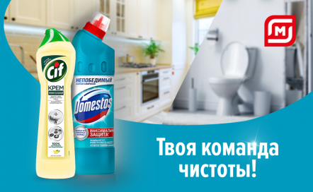С 5 апреля 2023 года участвуйте в акции от Unilever. Покупайте продукцию Domestos, Cif, Glorix в магазинах сети «Магнит», регистрируйте чеки и выигрывайте призы. Твоя команда чистоты!