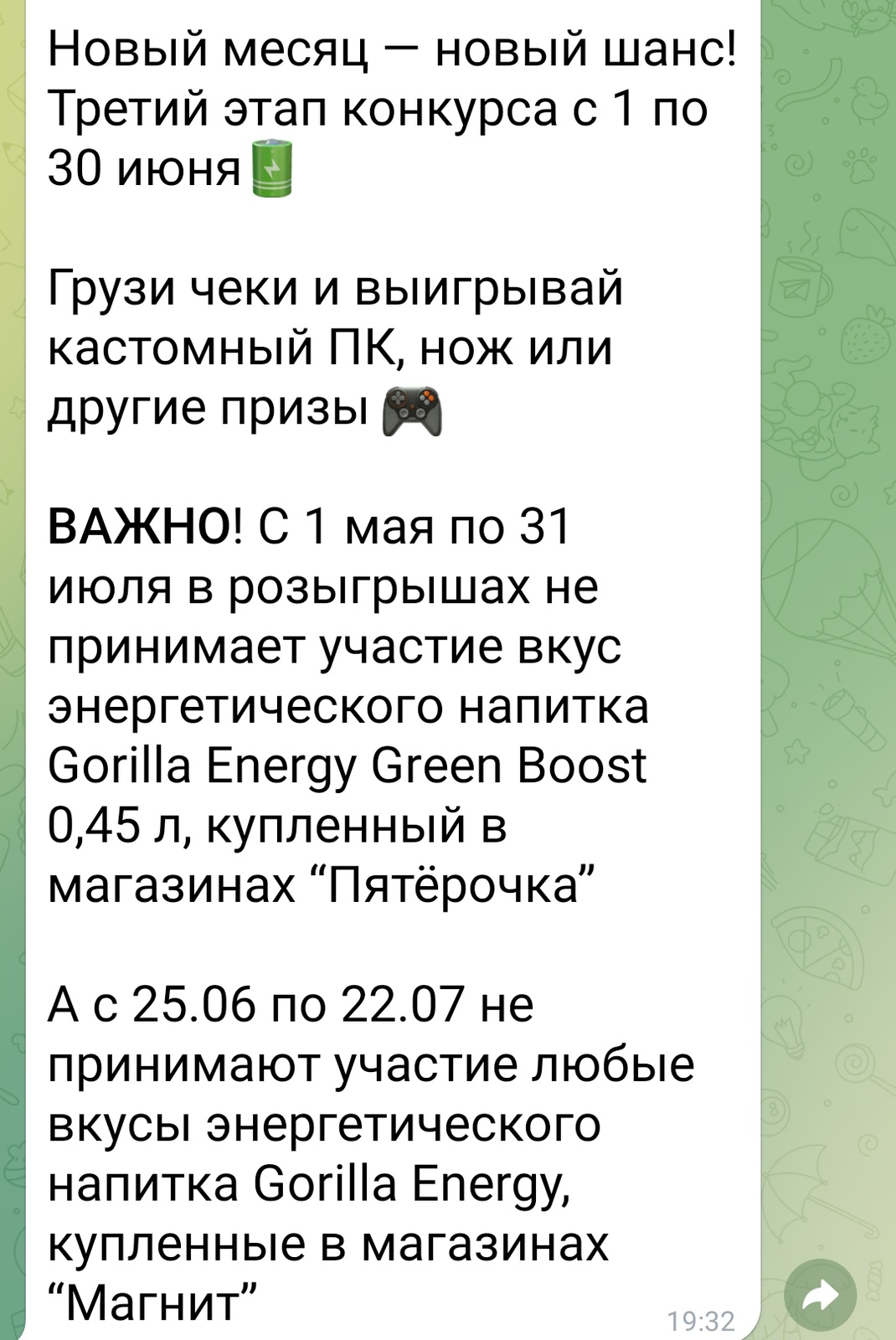 Подтвердите участие в акции приложении «Магнит», покупайте продукцию Gorilla Energy, сканируйте карту Магнит Плюс на кассе и участвуйте в розыгрыше призов.