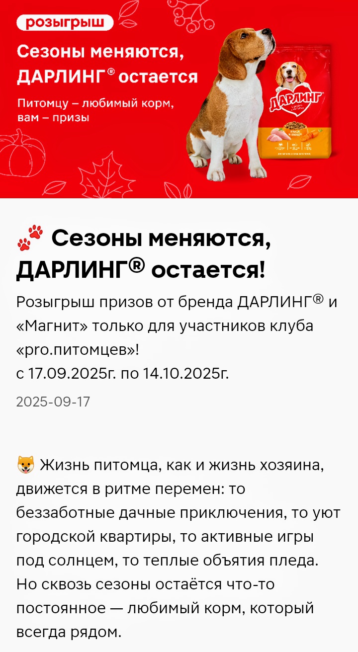 Сезоны меняются, ДАРЛИНГ остается! Питомцу - любимый корм, вам – призы