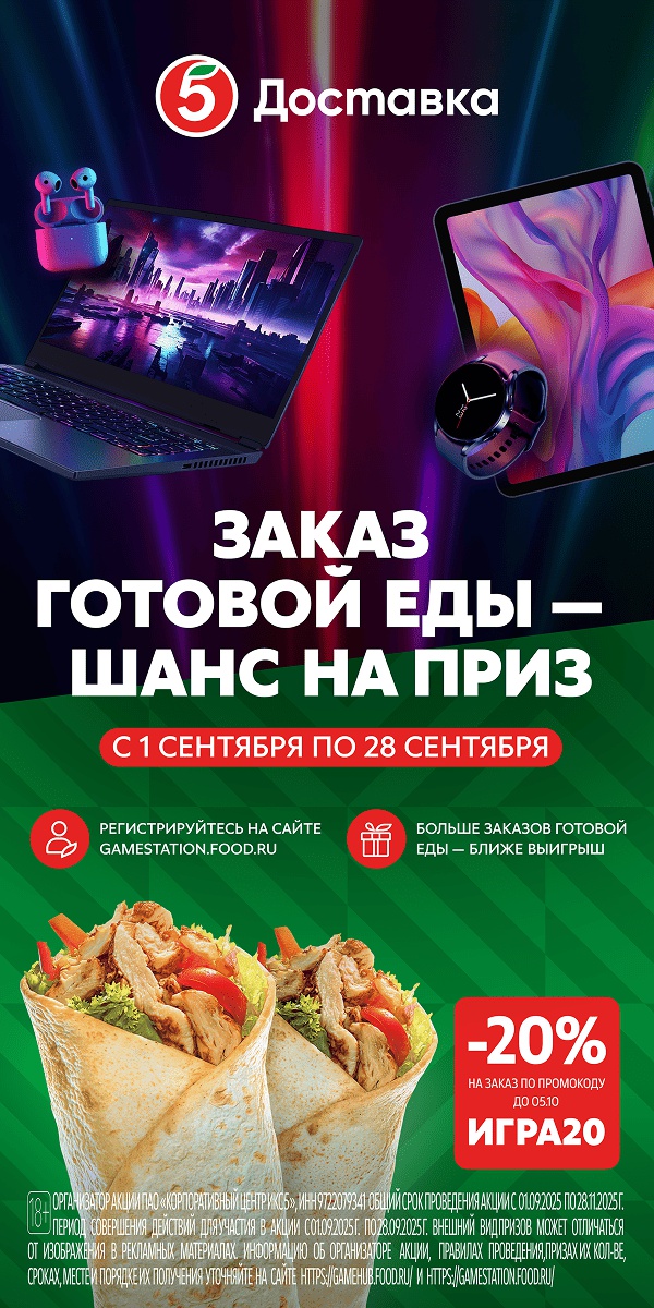 Каждую неделю разыгрываем призы за заказ готовой еды из «Пятёрочки».