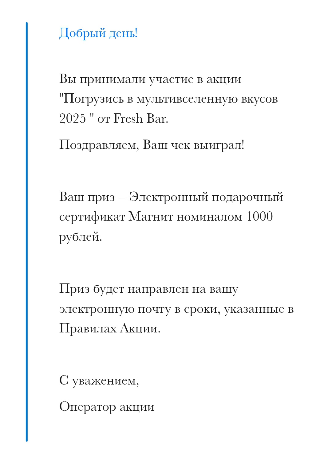 - Чтобы участвовать в акции, покупай любые напитки Fresh Bar и регистрируй чеки;