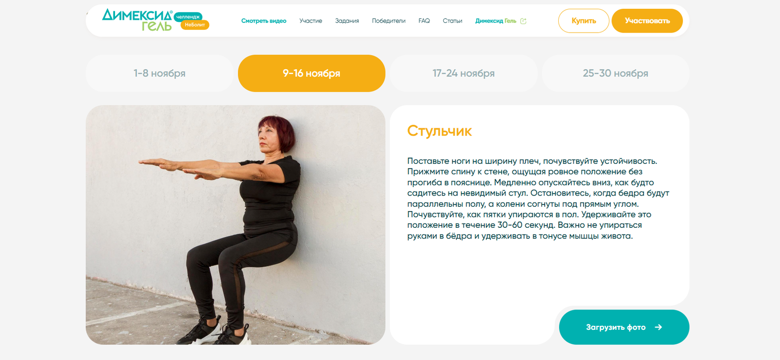 Каждую неделю мы выкладываем новое спортивное задание. Внимательно ознакомьтесь с прошедшими и будущими заданиями месяца. Для участия в розыгрыше призов вам необходимо загрузить фотографии в соответствии с заданием каждой недели месяца.
