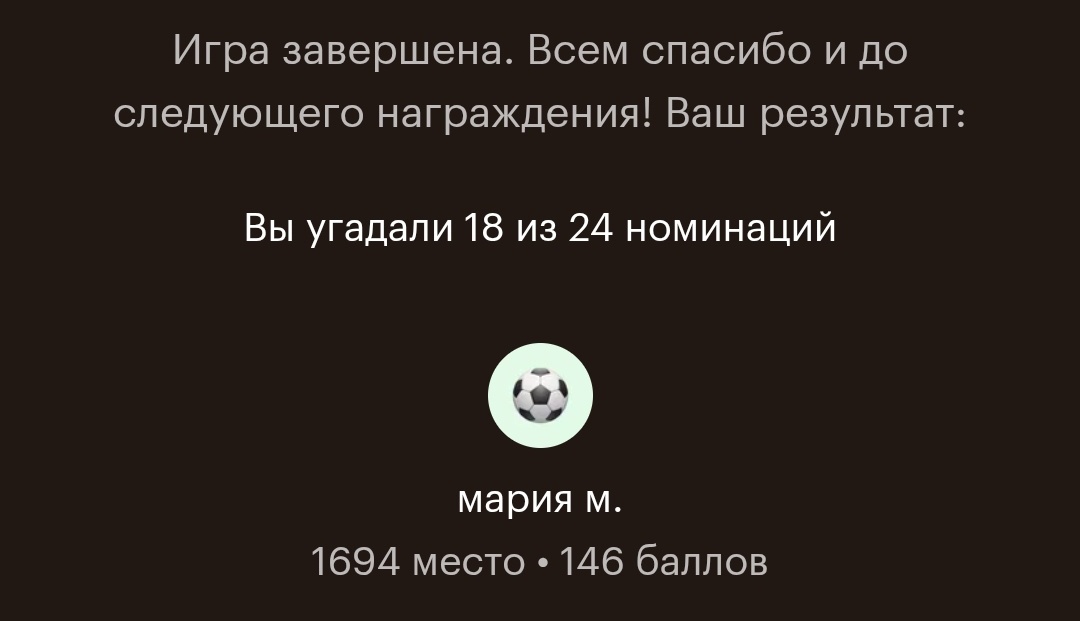 Ну это прям редкостным везунчиком нужно было быть, чтобы в сотню войти. Я "погорела" на лучшей мужской роли. Остальные номинации, которые не угадала, баллов давали совсем немного.