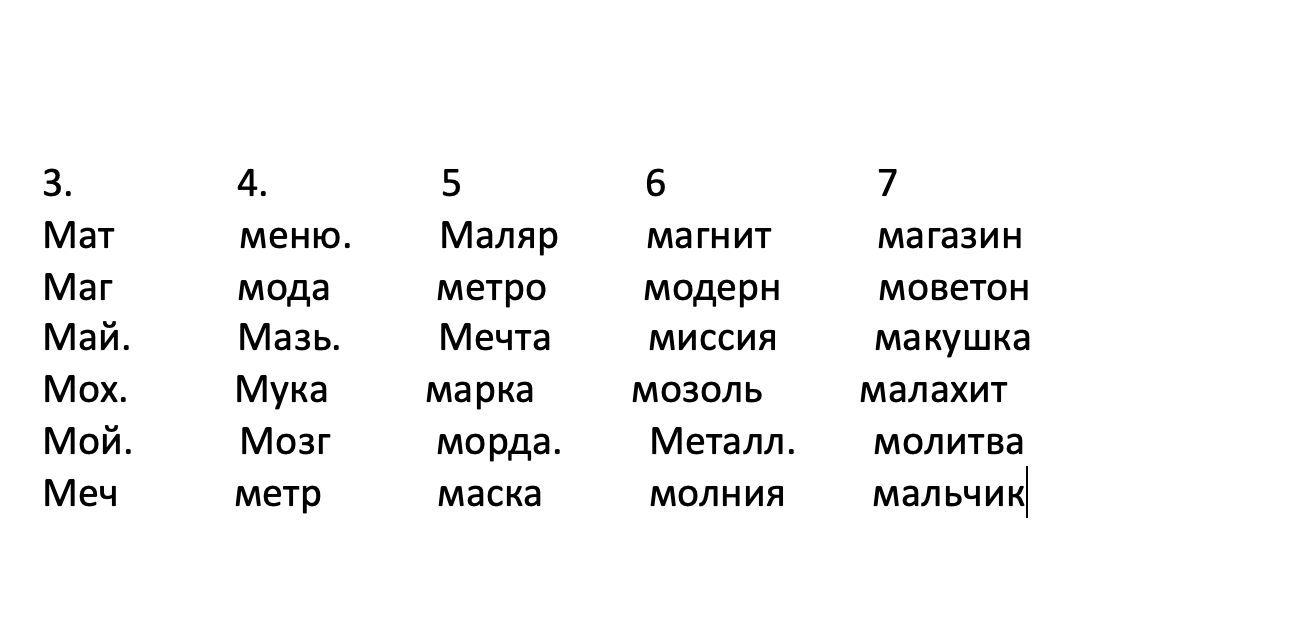 мечта мафия магия магма мания маляр матка манто мешок мажор мачта мадам марка минус минут мажор масса маска