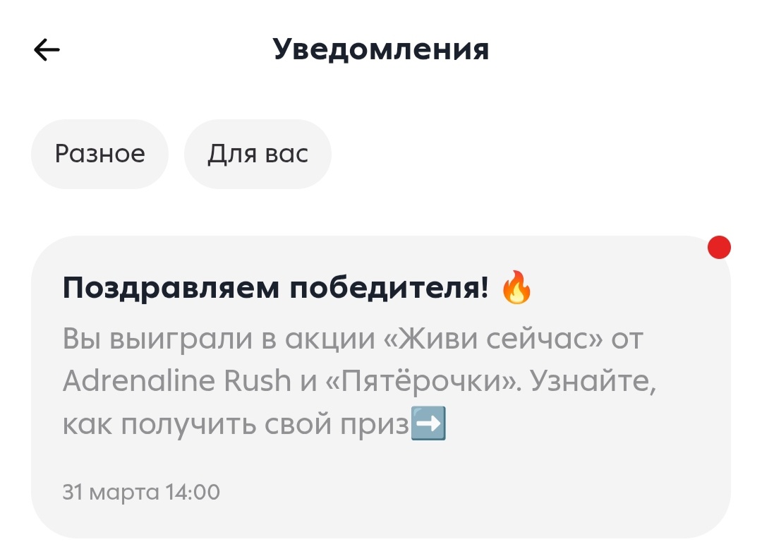 Участвуйте в акции от Adrenaline Rush в магазинах «Пятерочка». Покупайте продукцию Adrenaline Rush, Drive Me, Evervess, J7 Frustyle с картой «Х5 Клуба», получите гарантированный приз за первую покупку, участвуйте в розыгрыше призов. Выиграйте гоночный тур!