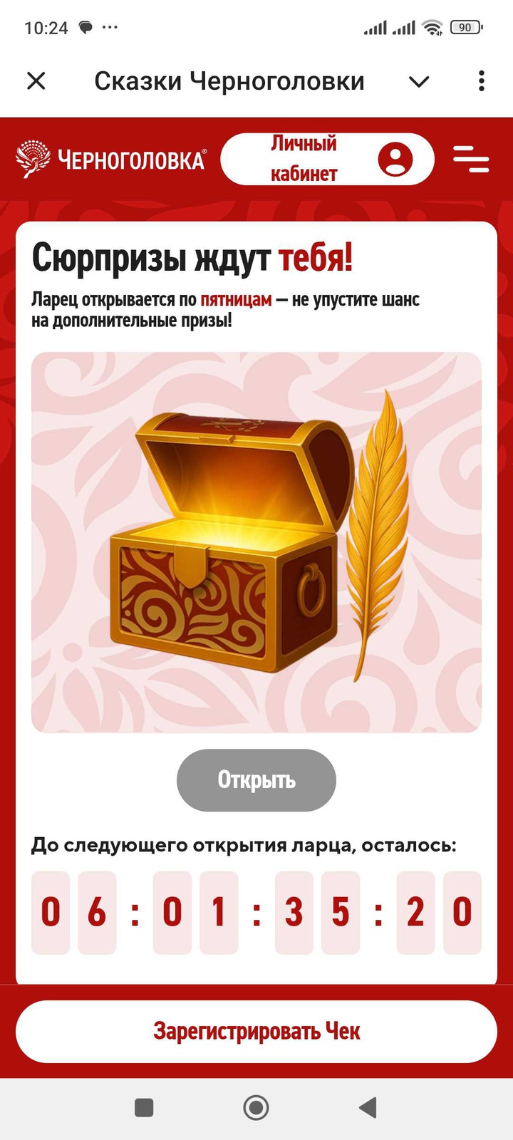 В течение периода проведения Акции Ларцы открывались каждую пятницу с 12:00 по Москве. Даже один принятый чек давал возможность открывать Ларцы еженедельно.