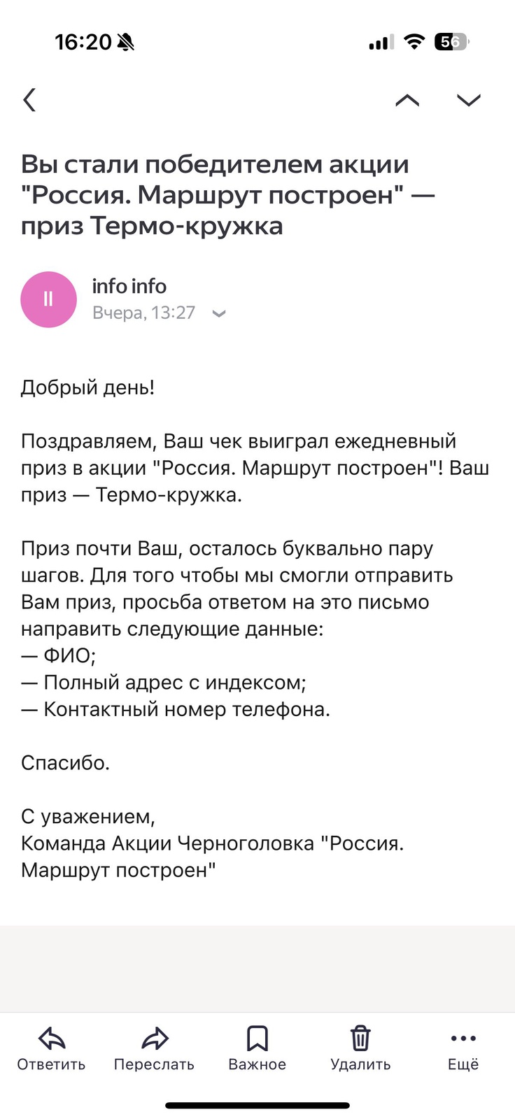 а у меня другая ситуация с их, якобы, ошибкой: прислали запрос на доки +куча всяких доков на подпись на хороший и дорогой приз.