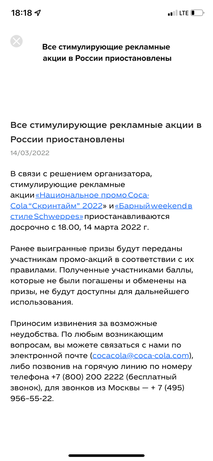 В связи с решением организатора, стимулирующие рекламные акции «Национальное промо Coca-Cola “Скринтайм” 2022» и «Барный weekend в стиле Schweppes» приостанавливаются досрочно с 18.00, 14 марта 2022 г.