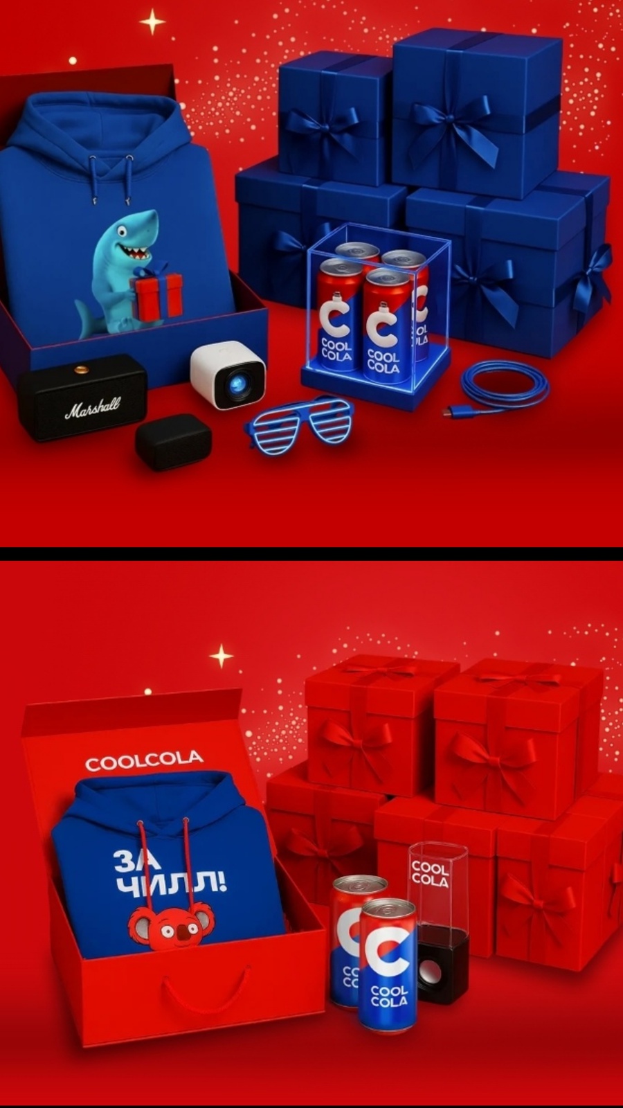 - Подарочные CoolBox(ы): портативная музыкальная колонка, лимитированное худи с маскотом CoolCola, баночки с напитками CoolCola.