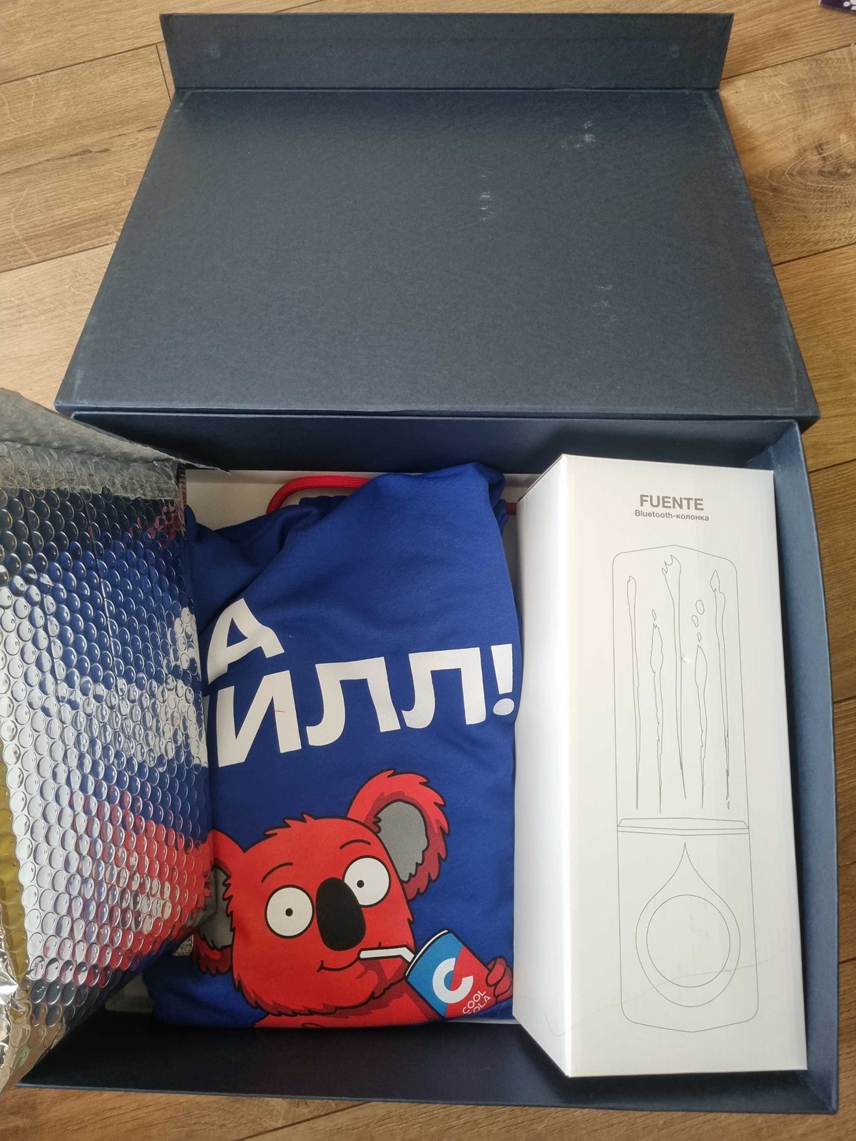 Привезли приз. Ноунейм колонка, брендированная кул колой, 2 банки колы и худи на слона.