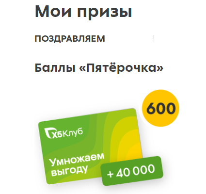 - 40000 баллов на карту «Х5 Клуба» - 600 шт.;