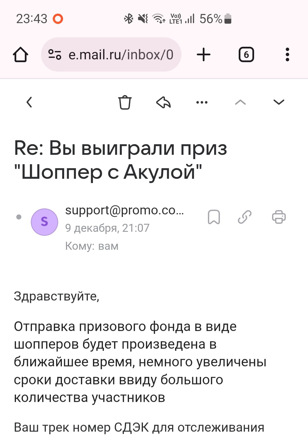 Рассылка призового фонда согласно срокам, указанным в правилах акции. Ожидайте, пожалуйста. Все призы будут разосланы победителям
