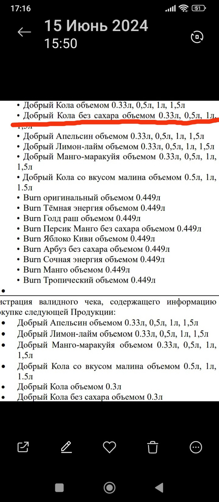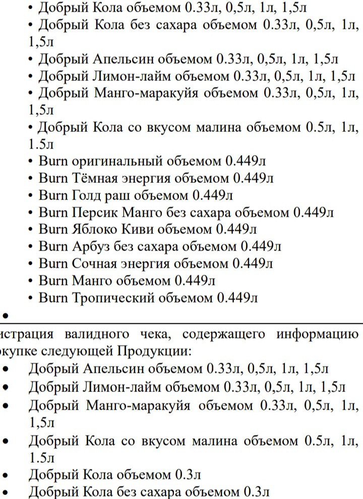 - В акции участвует напиток безалкогольный сильногазированный со вкусами: «Кола» Добрый®, «Кола без сахара» Добрый®, «Апельсин с витамином С» Добрый®, «Лимон – Лайм» Добрый®, «Манго-Маракуйя» Добрый® объёмом 0,33л., 0,5л., 1л., 1,5л и «Кола» со вкусом малины Добрый® объёмом 0,5л., 1л., 1,5л.