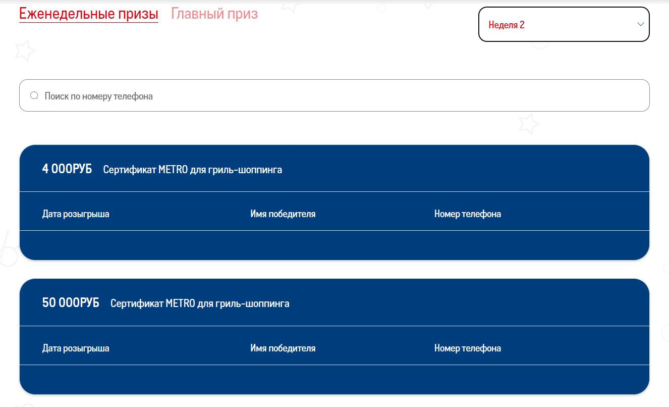 - Подарочная карта METRO номиналом 50 000 руб. (1 шт. в неделю, всего 4 шт.);