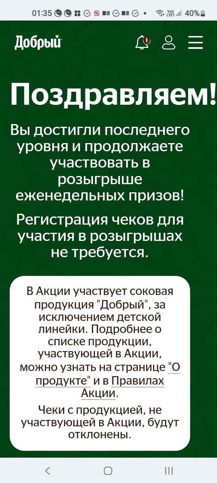 С 1 марта 2024 года участвуйте в акции от «Добрый». Покупайте соки и нектары «Добрый», участвующие в акции, регистрируйте чек и выигрывайте призы.
